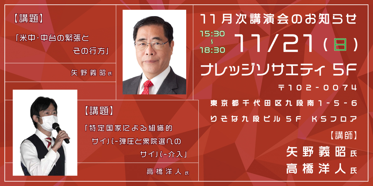 11月次講演会開催 主催:日本安全保障フォーラム 共催:Channel AJER 栗山 勉 日時:2021年11月21日(日) 15:30~18:30 開場:15:00~ 開演:15:30~ 参加費用:3,000円(税込 […]